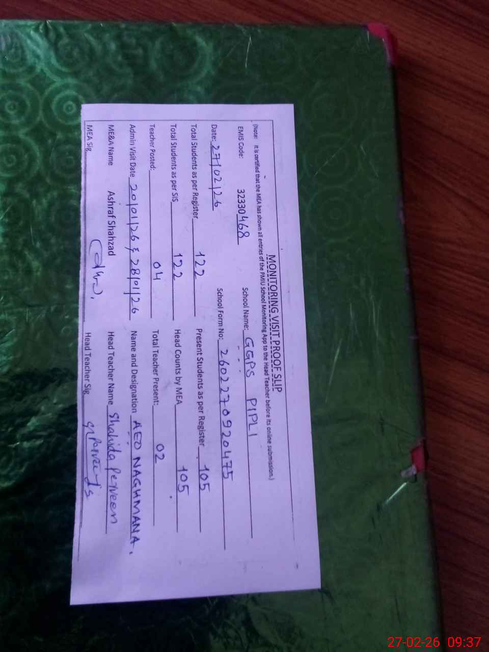 | EMIS Code: 32330468 | Name of School: GGPS PIPLI | |||