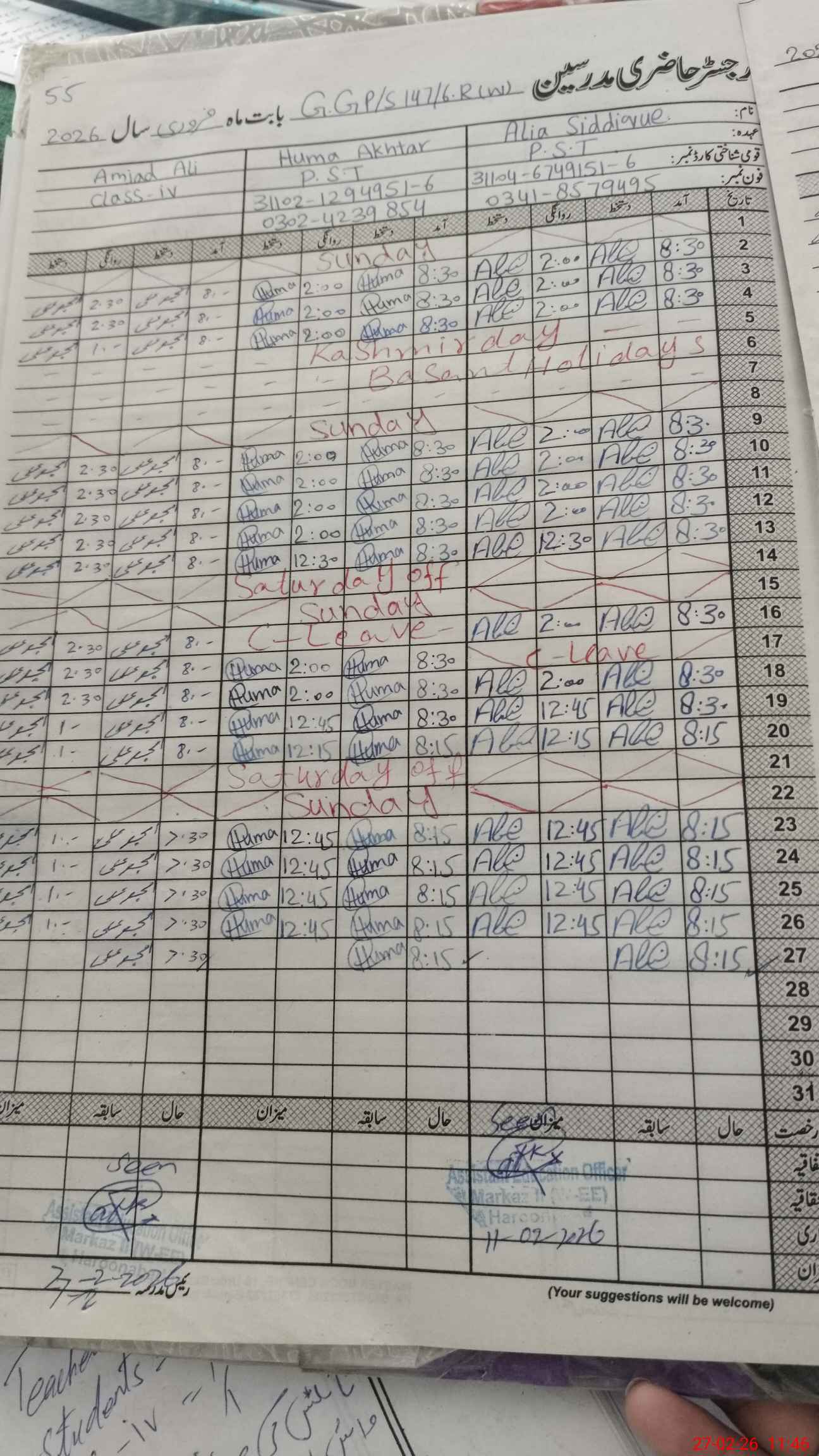 | Name: Al**** Si**** Designation: (School Headmaster's/Headmistress's) PST Phone/Cell Number: 03**** |