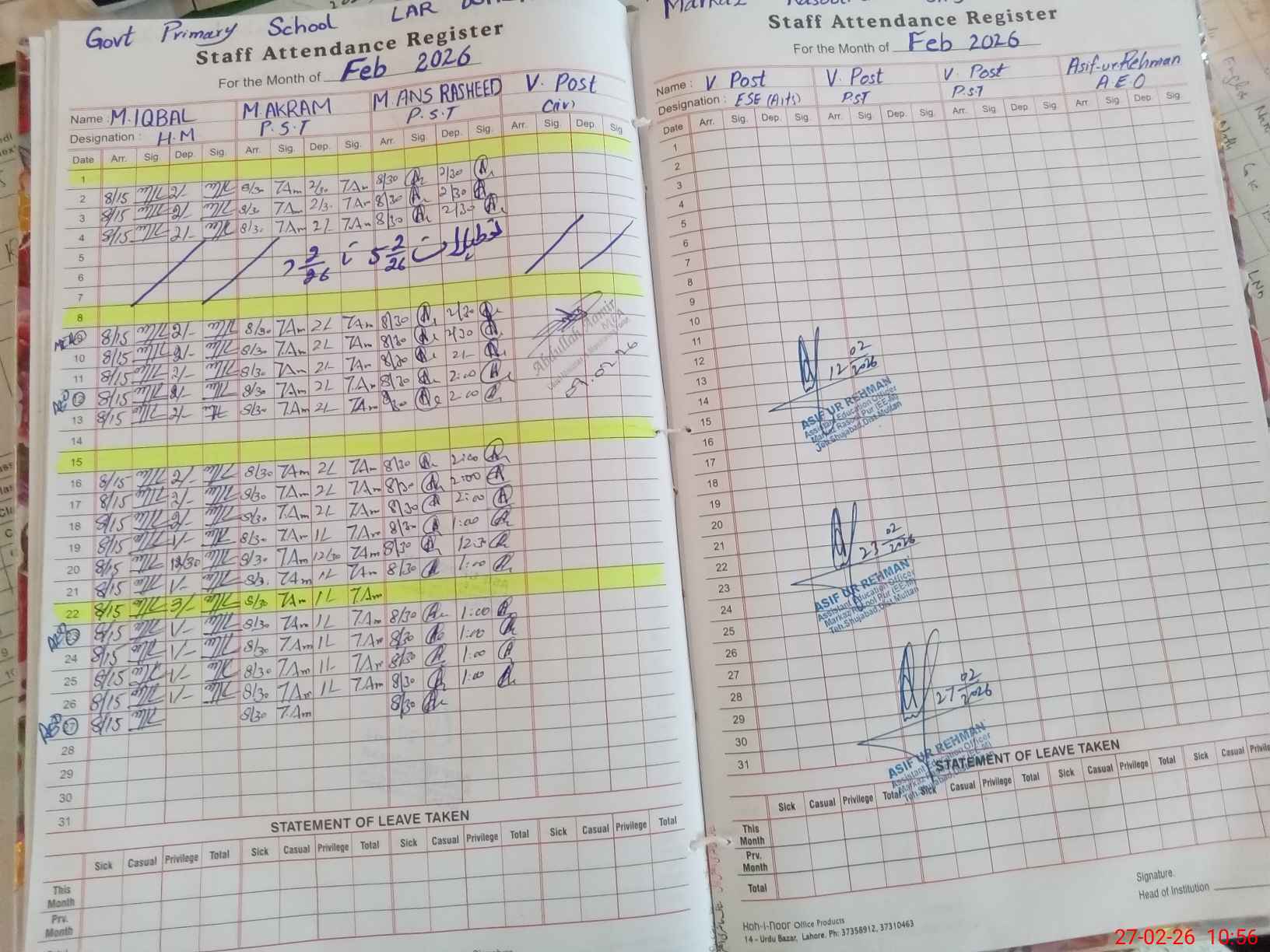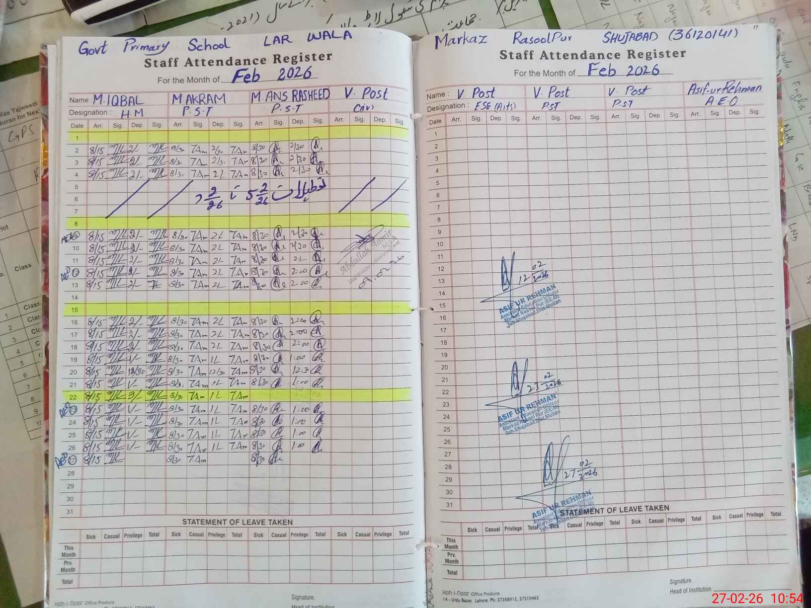 | CNIC | Full Name | Designation | R/C | Absence During Last Calender Month |