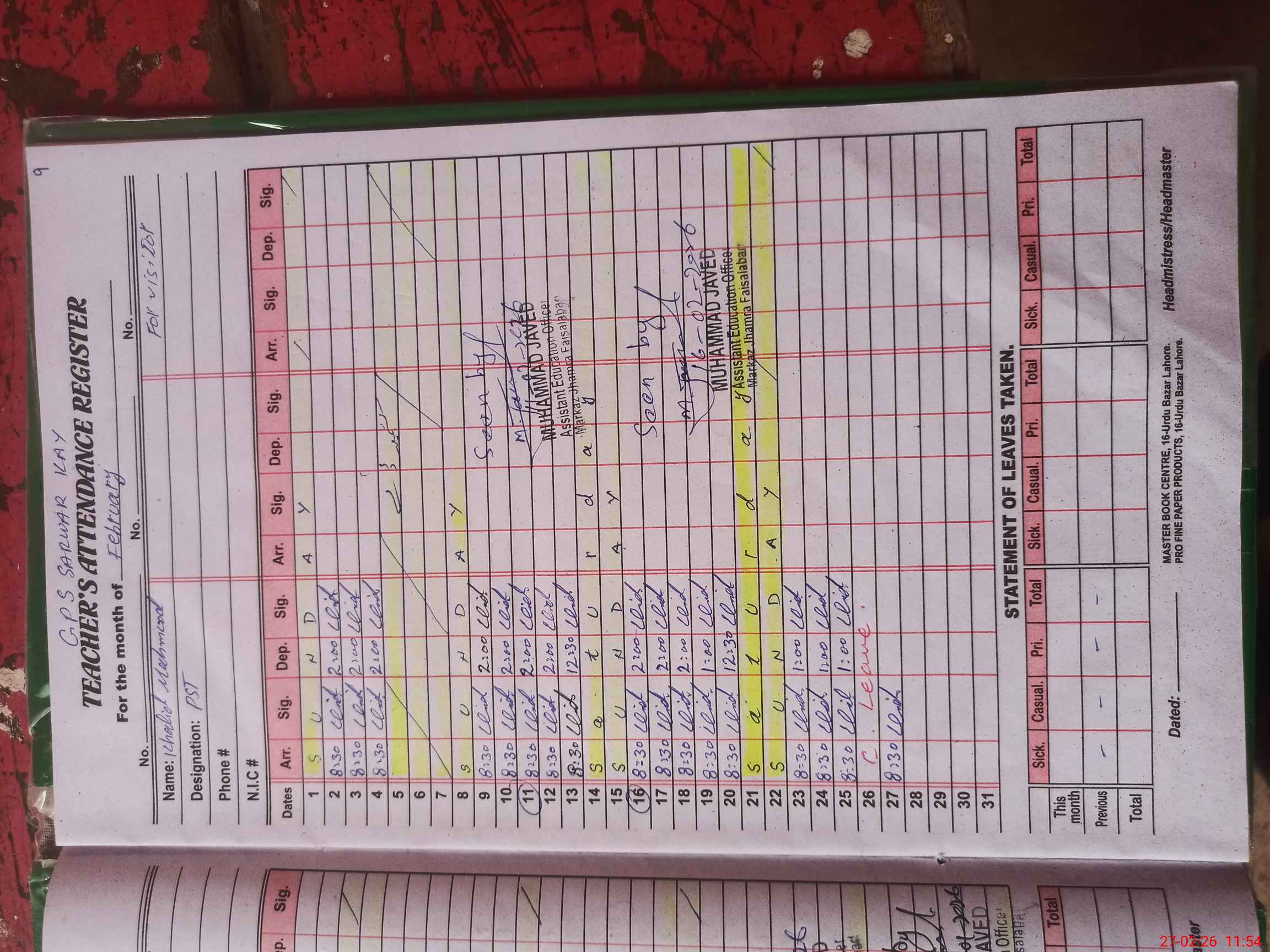 | CNIC | Full Name | Designation | R/C | Absence During Last Calender Month |