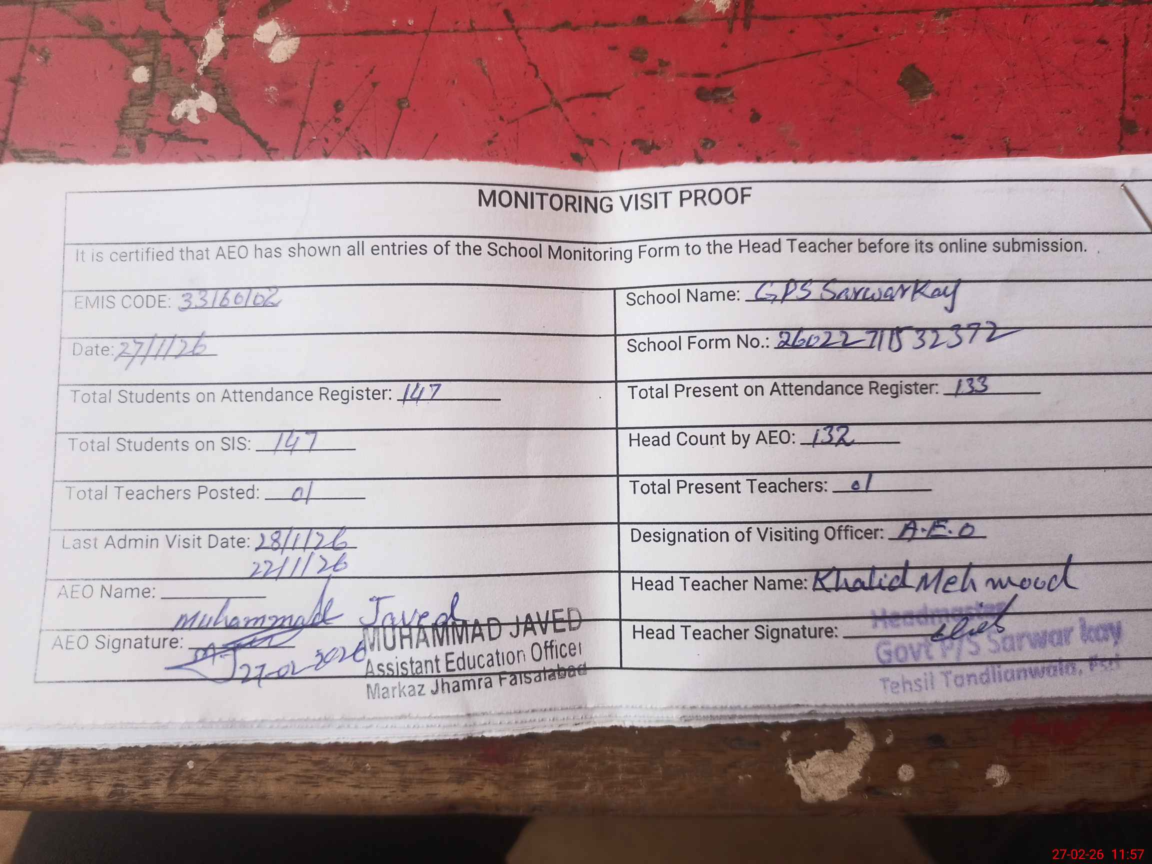 | Attendance Register | Head Teacher | MEA with School | Visit Proof |