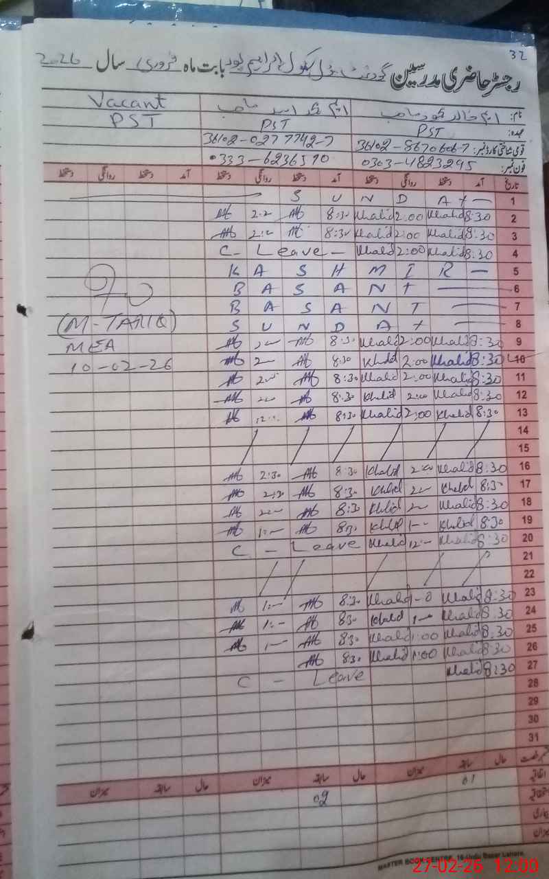 | CNIC | Full Name | Designation | R/C | Absence During Last Calender Month |