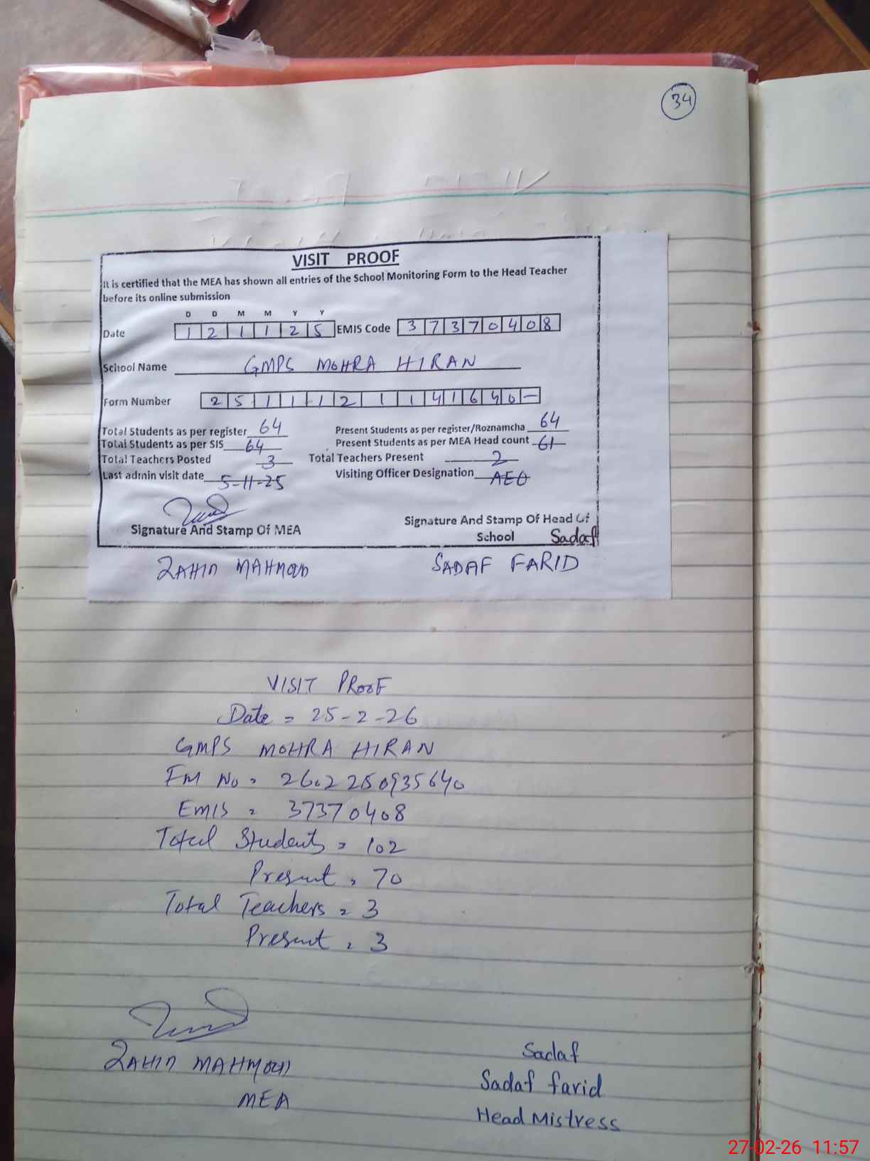 | Attendance Register | Head Teacher | MEA with School | Visit Proof |