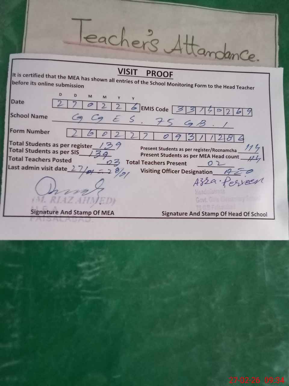 | Attendance Register | Head Teacher | MEA with School | Visit Proof |
