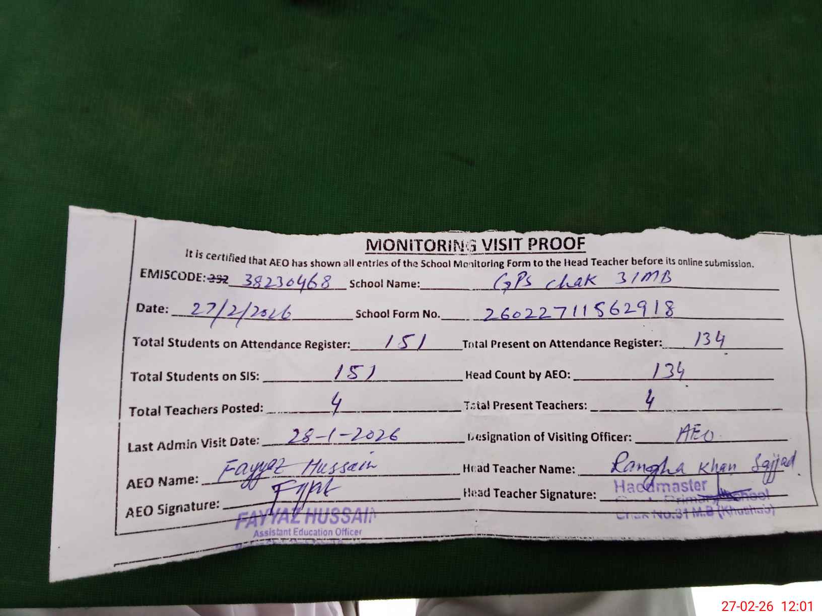 | EMIS Code: 38230468 | Name of School: GPS CHAK NO. 31 MB | |||