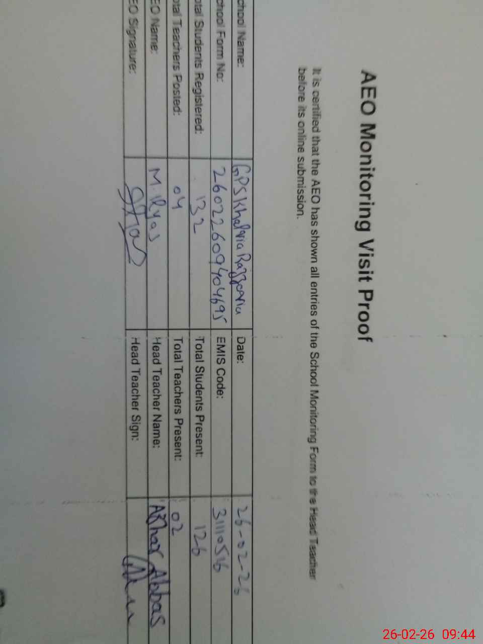 | Certified that this School was Inspected by the Undersigned MEA/DMO Today and the Information Stated Above is as Per Record. | |||||