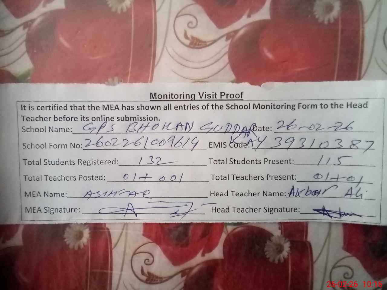 | Attendance Register | Head Teacher | MEA with School | Visit Proof |