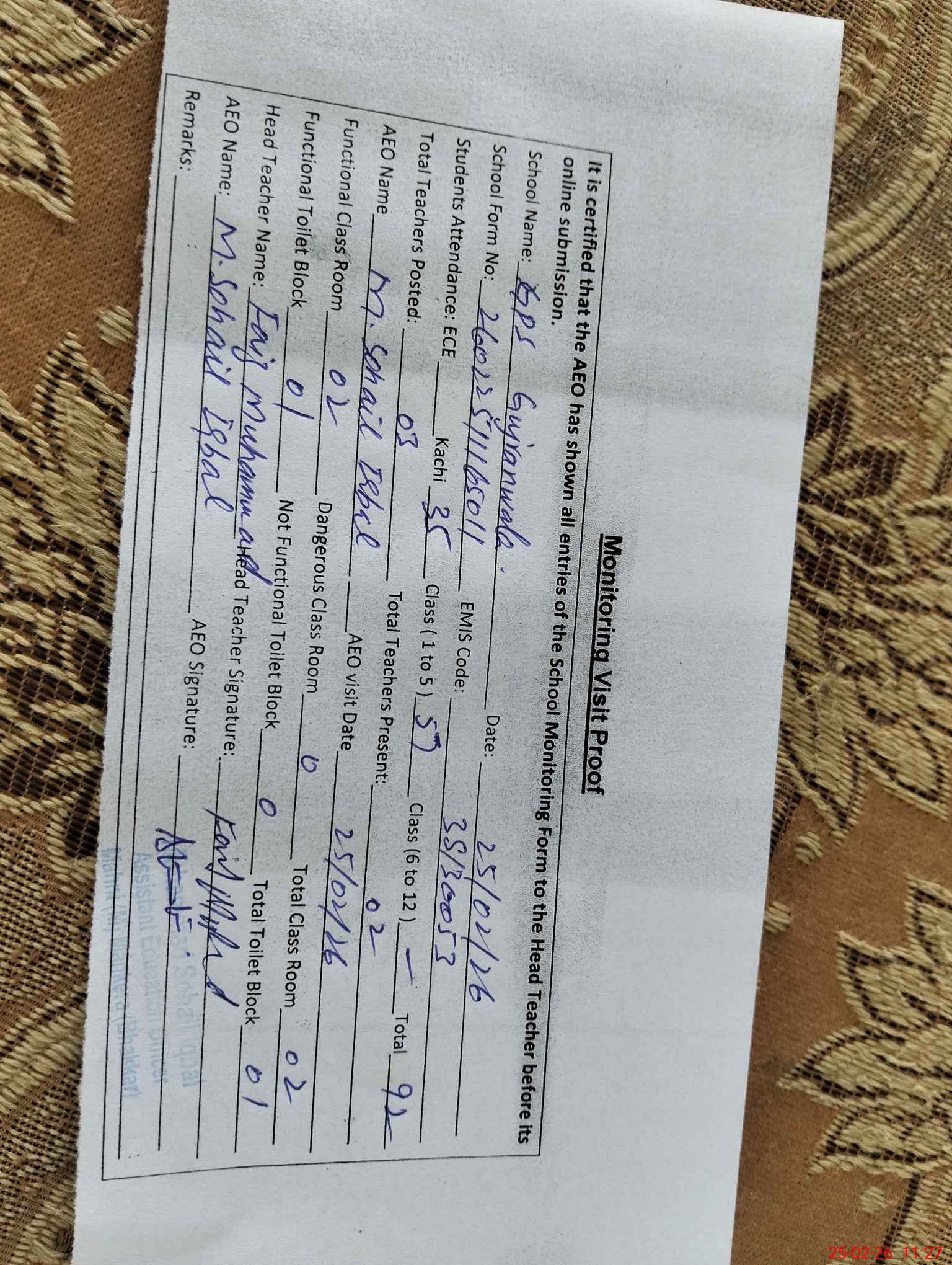 | EMIS Code: 38130053 | Name of School: GPS GUJRAN WALA | |||