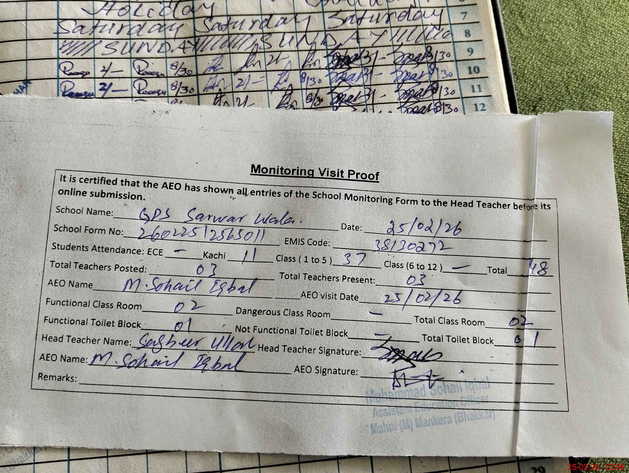 | EMIS Code: 38130272 | Name of School: GPS SARWAR WALA | |||