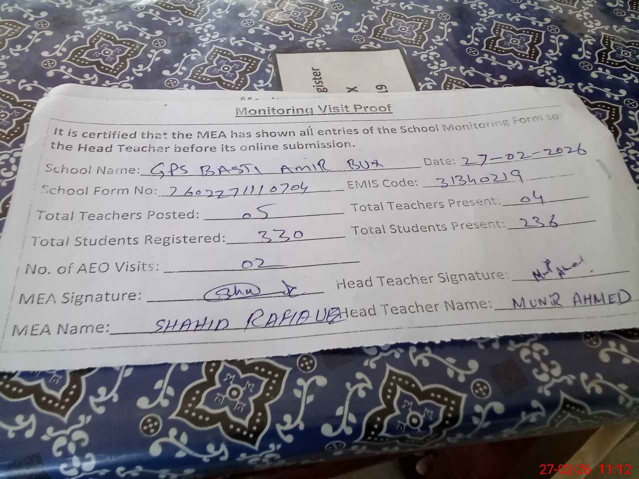 | EMIS Code: 31340219 | Name of School: GPS BASTI AMIR BUX | |||