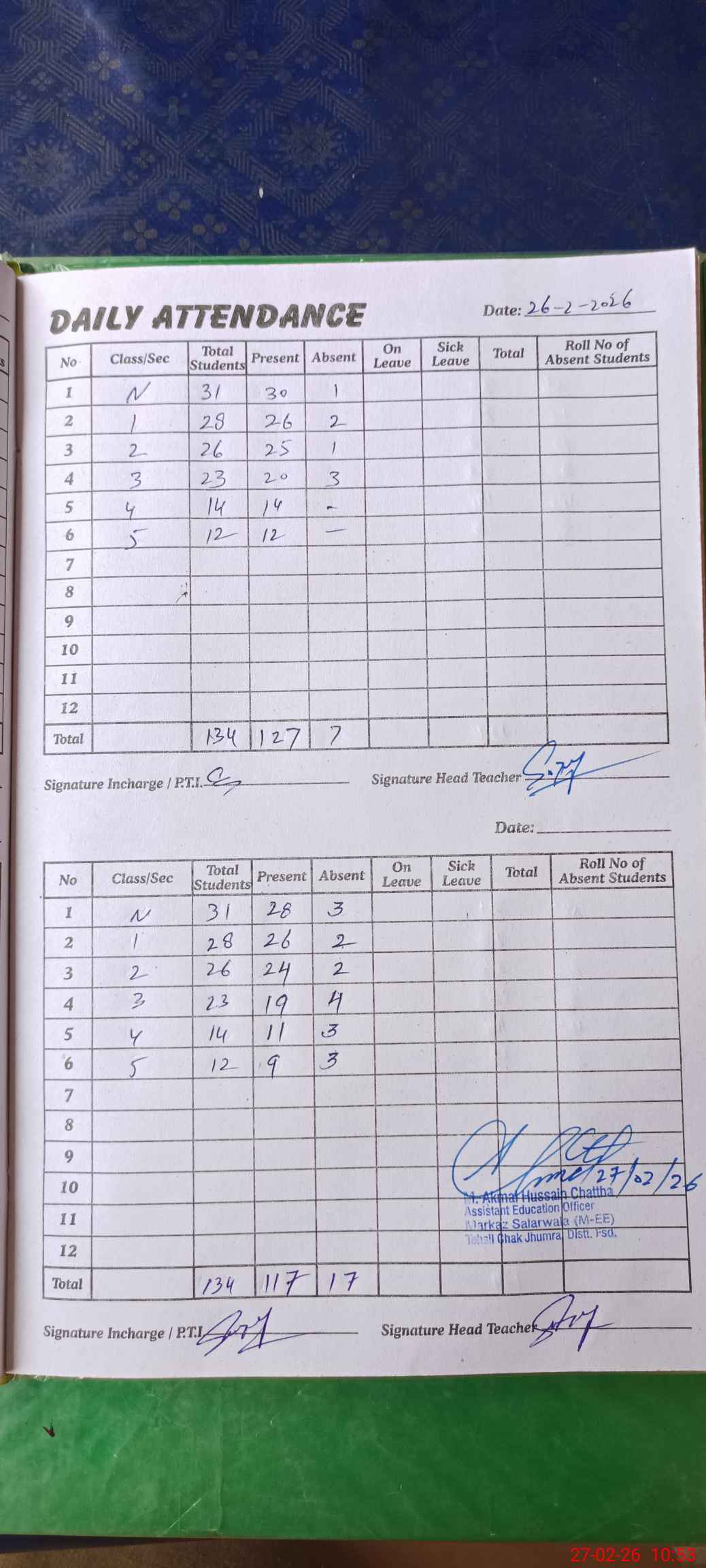 | Total no. of Classrooms: 5 No. of Classrooms Used for Teaching: 3 No. of Classrooms Storing Old Furniture, FTBs, etc: 0Comments if Any: 02 Additional Classrooms are being constructed under supervision of SMC (CM Punjab-Pakage For Missing Facilities). |