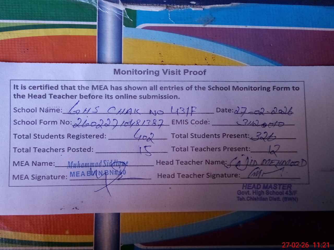 | Attendance Register | Head Teacher | MEA with School | Visit Proof |