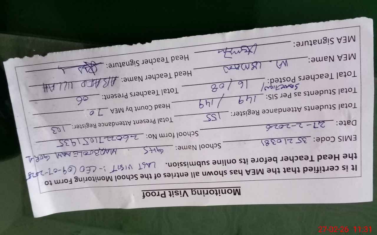 | Attendance Register | Head Teacher | MEA with School | Visit Proof |