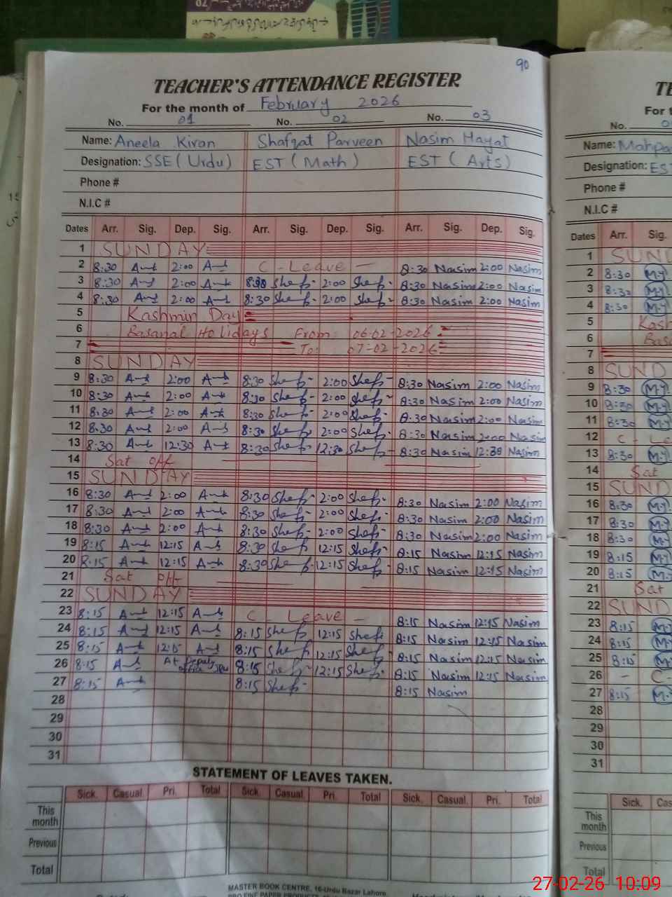 | CNIC | Full Name | Designation | R/C | Absence During Last Calender Month |