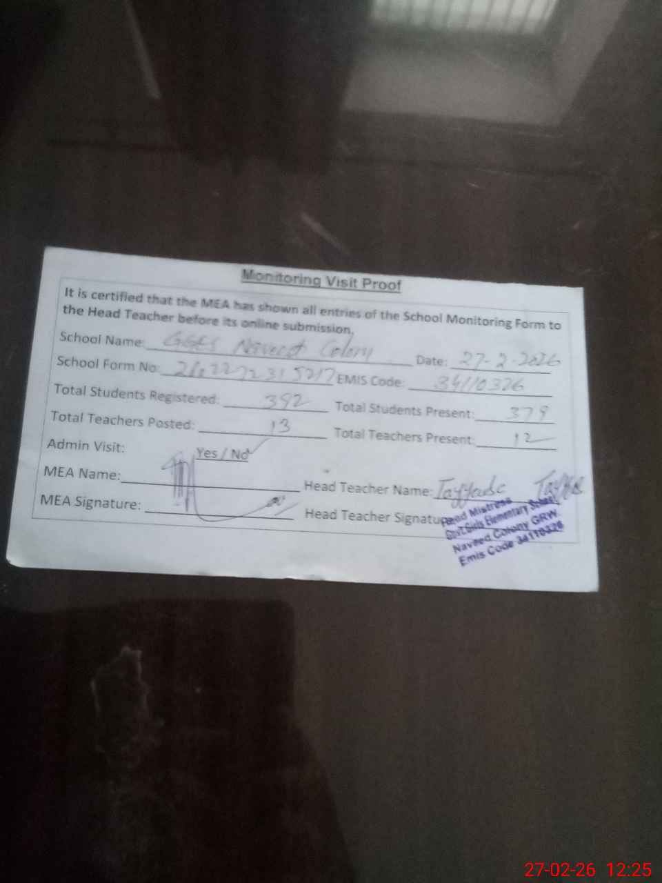 | EMIS Code: 34110326 | Name of School: GGES NAVEED COLONY | |||