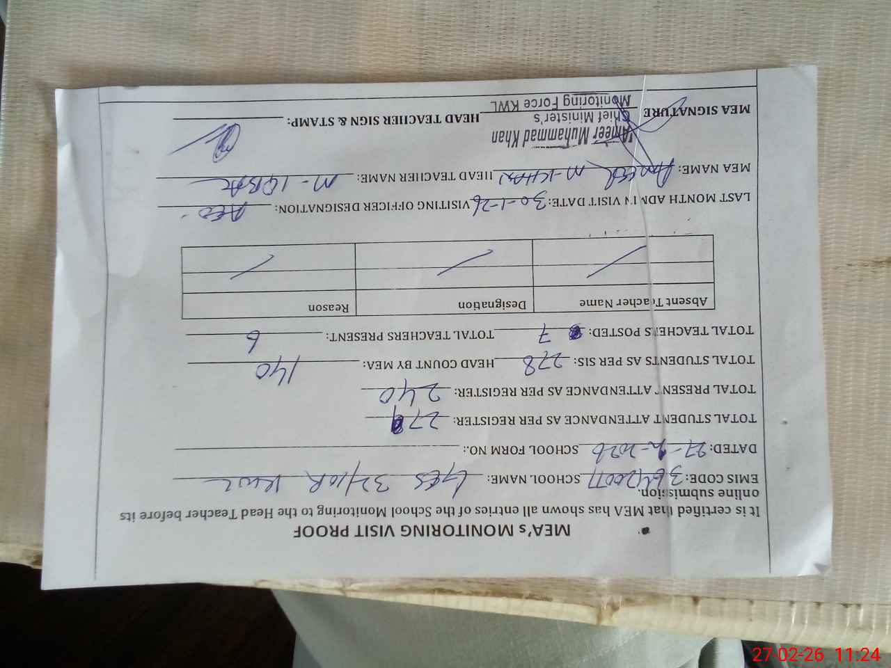 | Attendance Register | Head Teacher | MEA with School | Visit Proof |