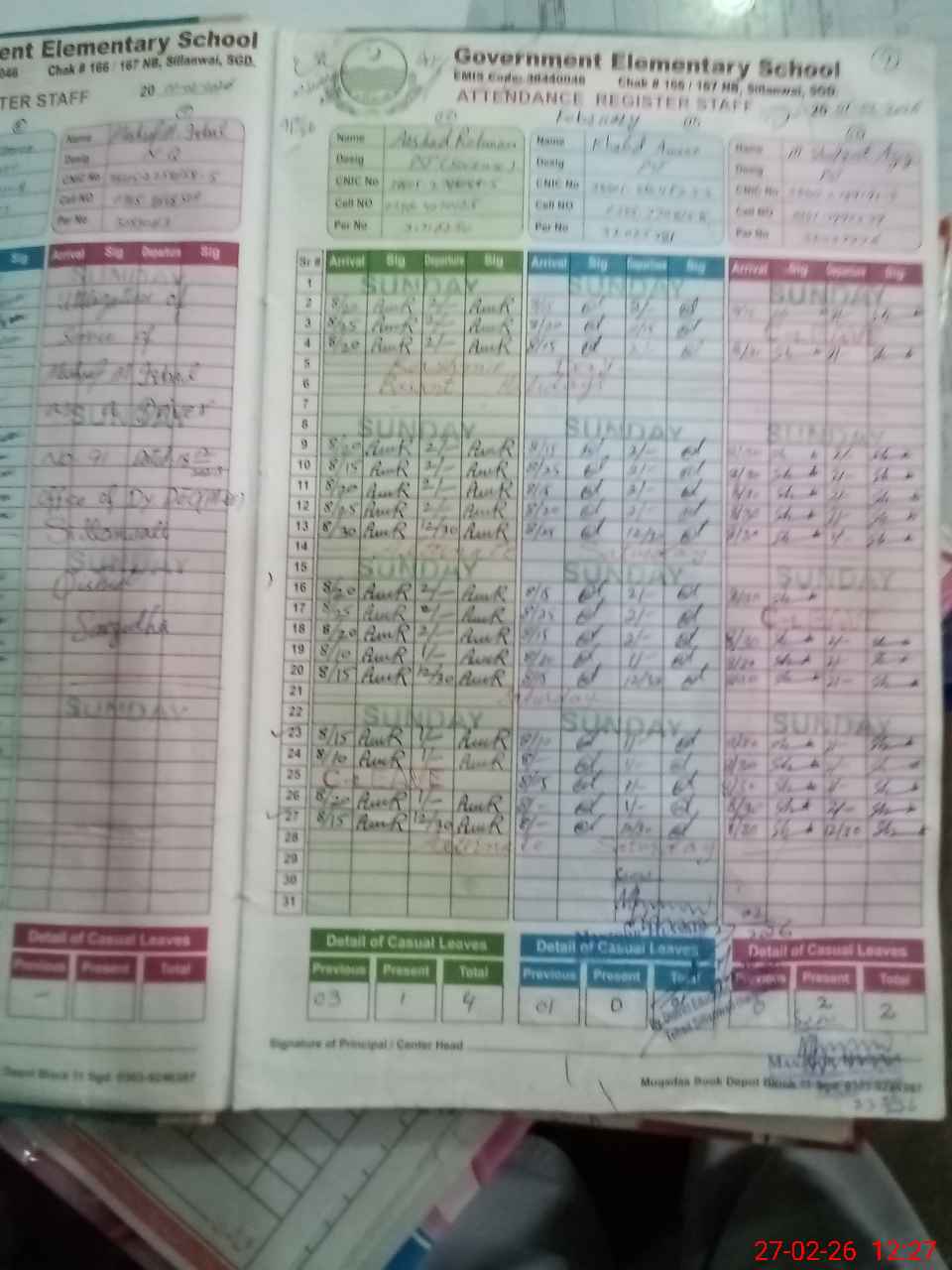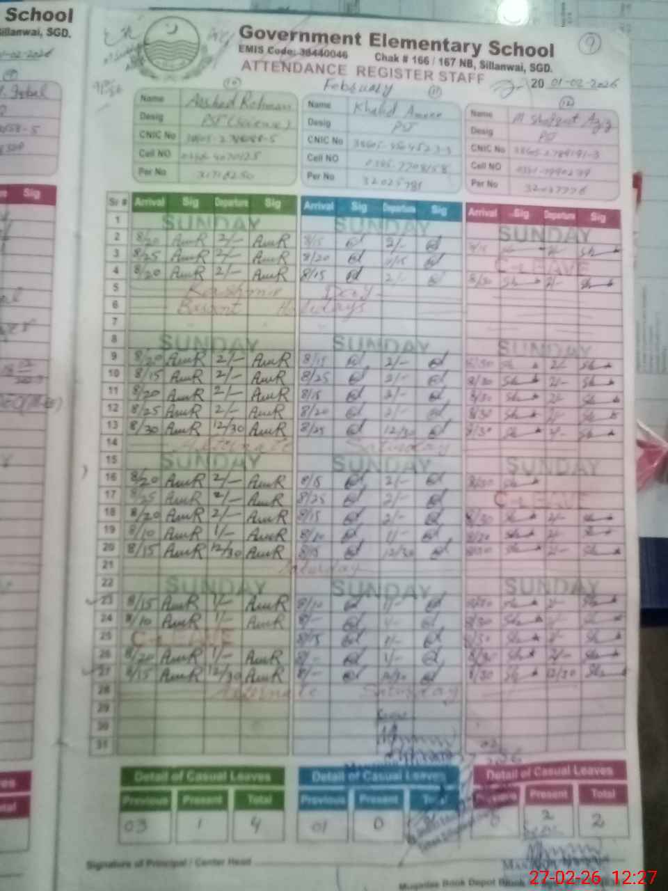 | CNIC | Full Name | Designation | R/C | Absence During Last Calender Month |