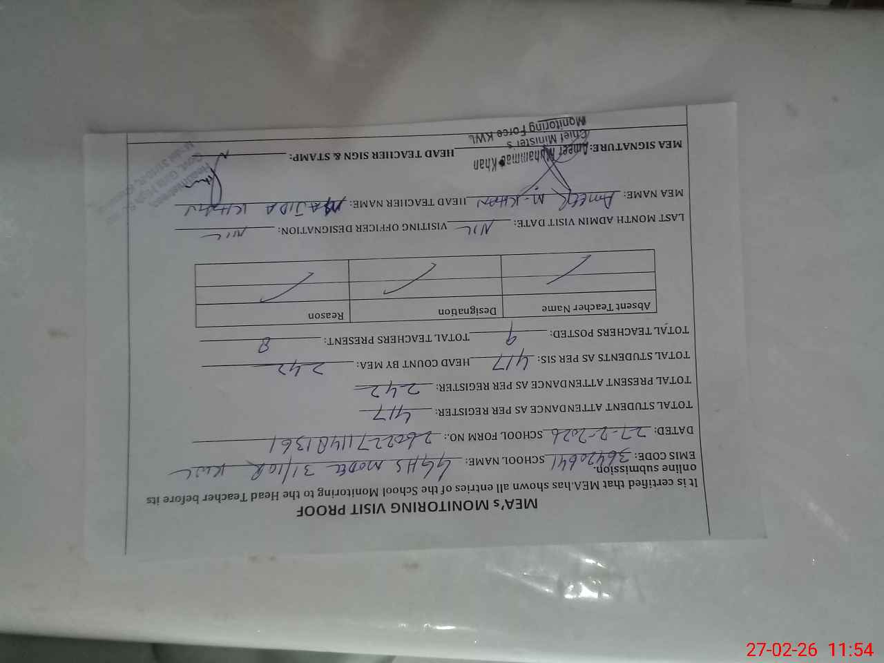 | Attendance Register | Head Teacher | MEA with School | Visit Proof |