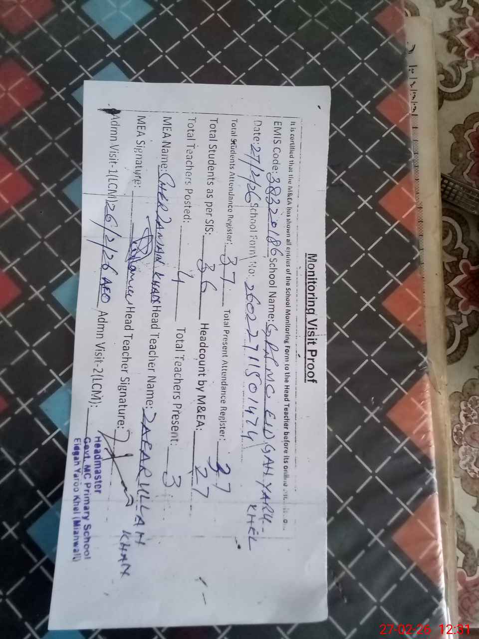 | Attendance Register | Head Teacher | MEA with School | Visit Proof |