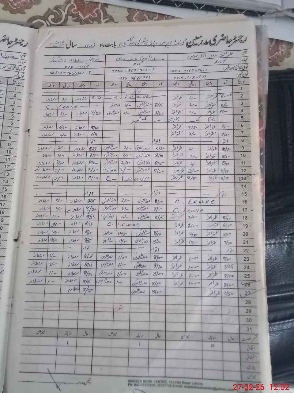 | CNIC | Full Name | Designation | R/C | Absence During Last Calender Month |