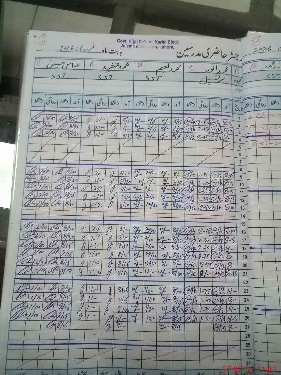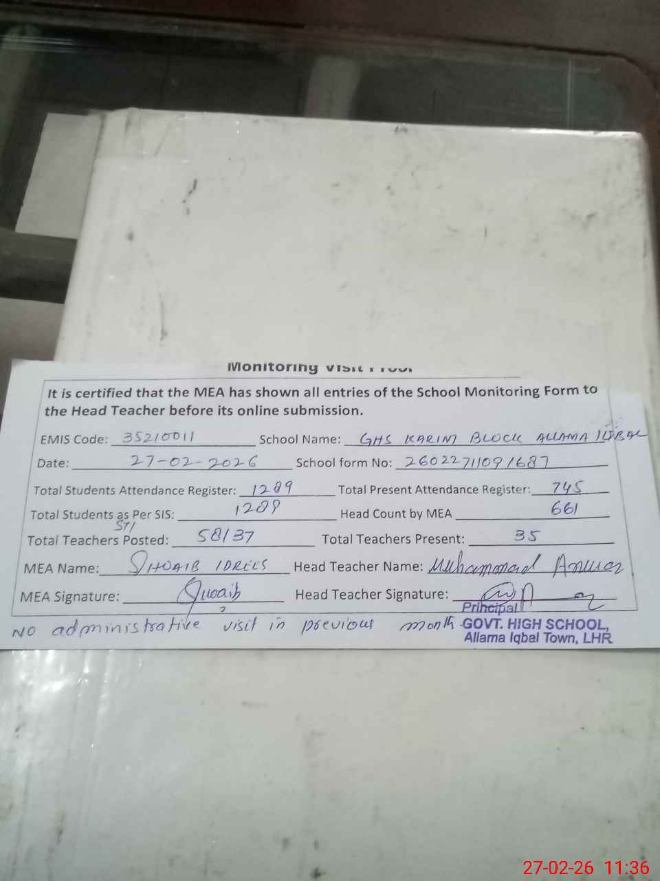 | EMIS Code: 35210011 | Name of School: GHS KARIM BLOCK ALLAMA IQBAL TOWN | |||