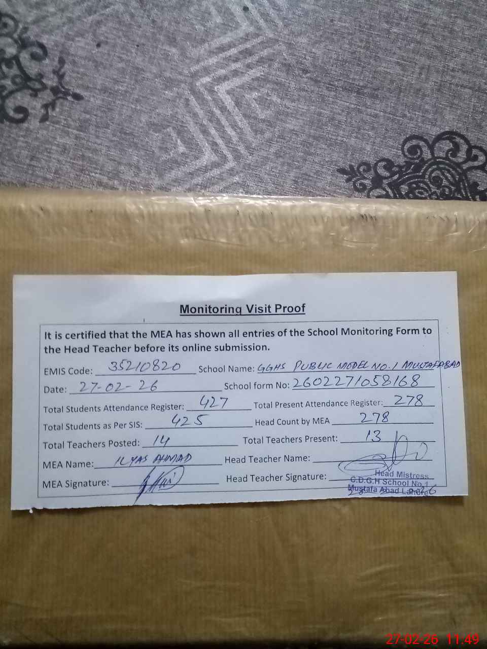 | EMIS Code: 35210820 | Name of School: GGHS PUBLIC MODEL NO.1 MUSTAFA ABAD (EX-MCL) | |||
