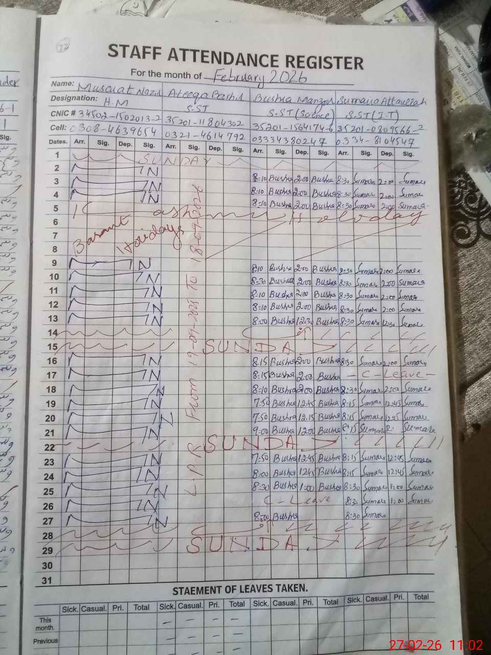 | Remarks (Use Separate Page if Required): Teacher Rubina Iqbal PST is marked absent today as medical leave wef 2 October 2025 to 26 March 2026 has not been approved so far | |||||