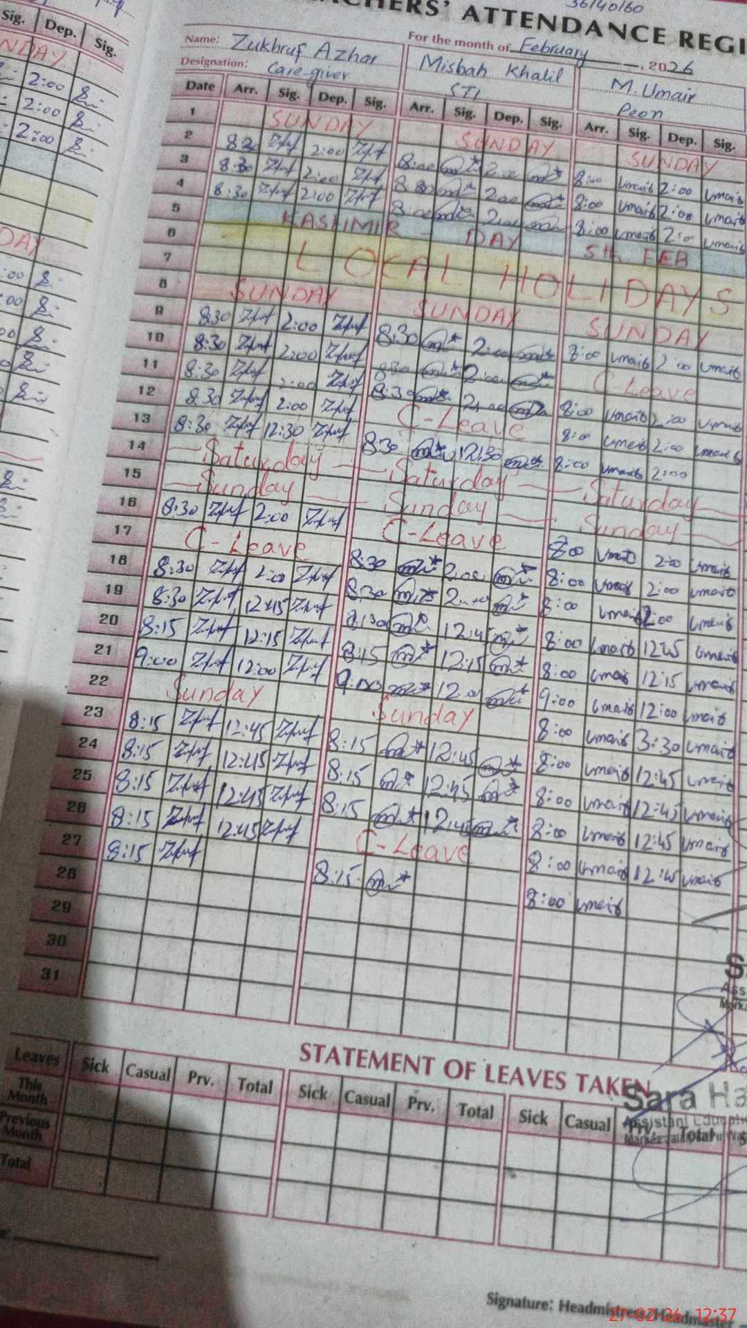 | Leave | Duty | Absent | Maternity | Medical | Ex- Pak |