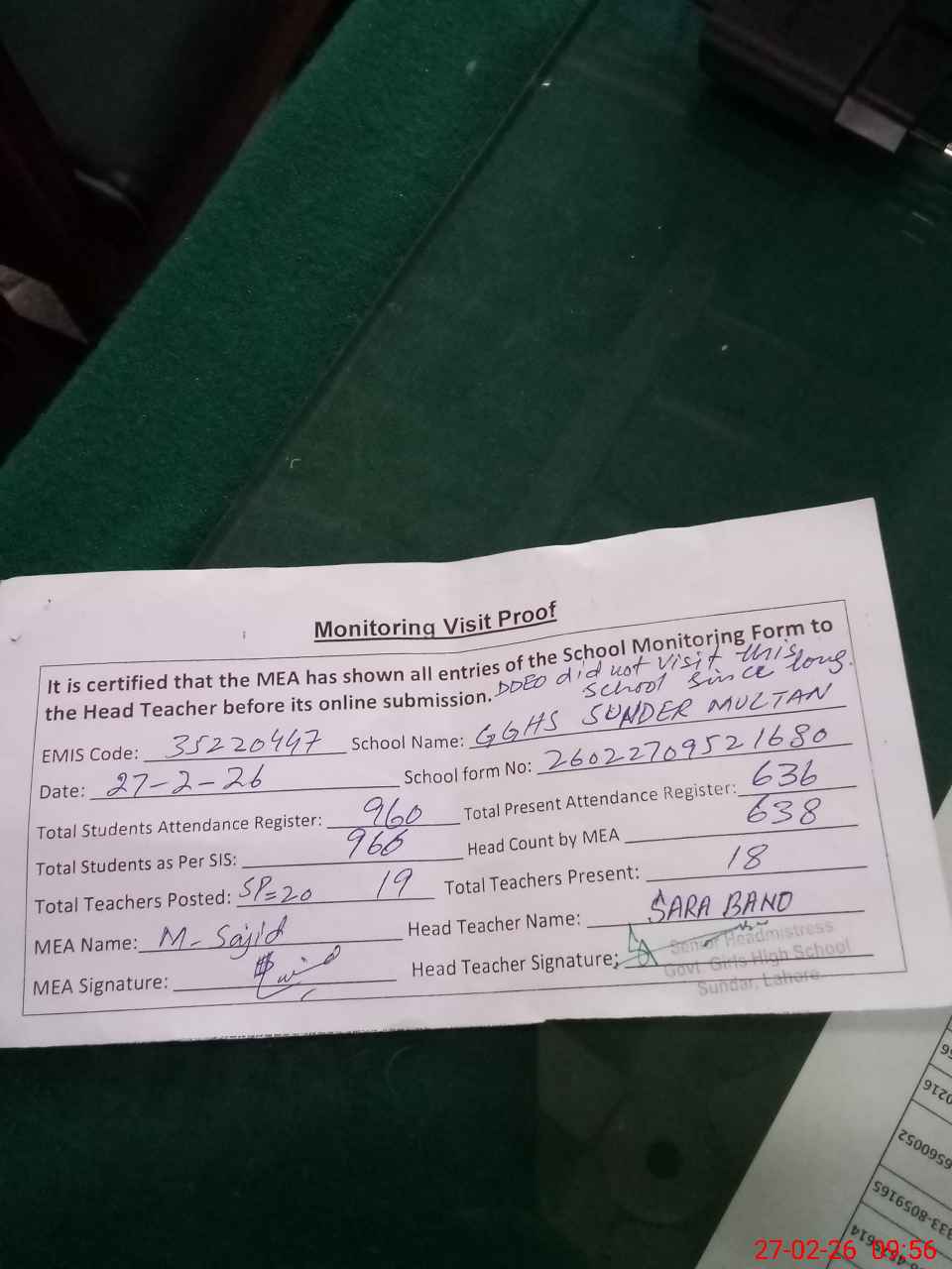 | EMIS Code: 35220447 | Name of School: GGHS SUNDER MULTAN ROAD LAHORE | |||