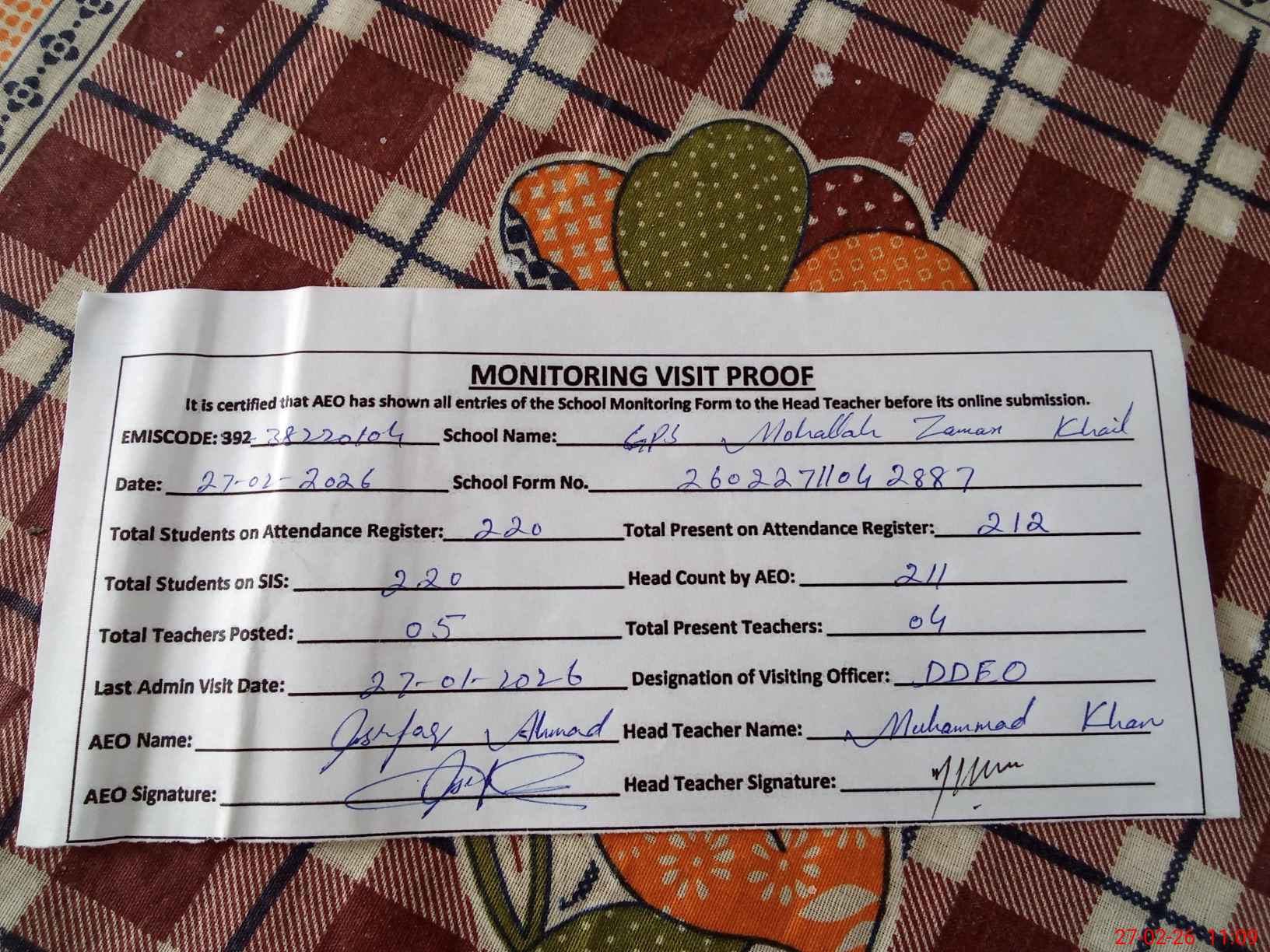 | EMIS Code: 38220104 | Name of School: GPS MOHALLAH ZAMAN KHAIL | |||