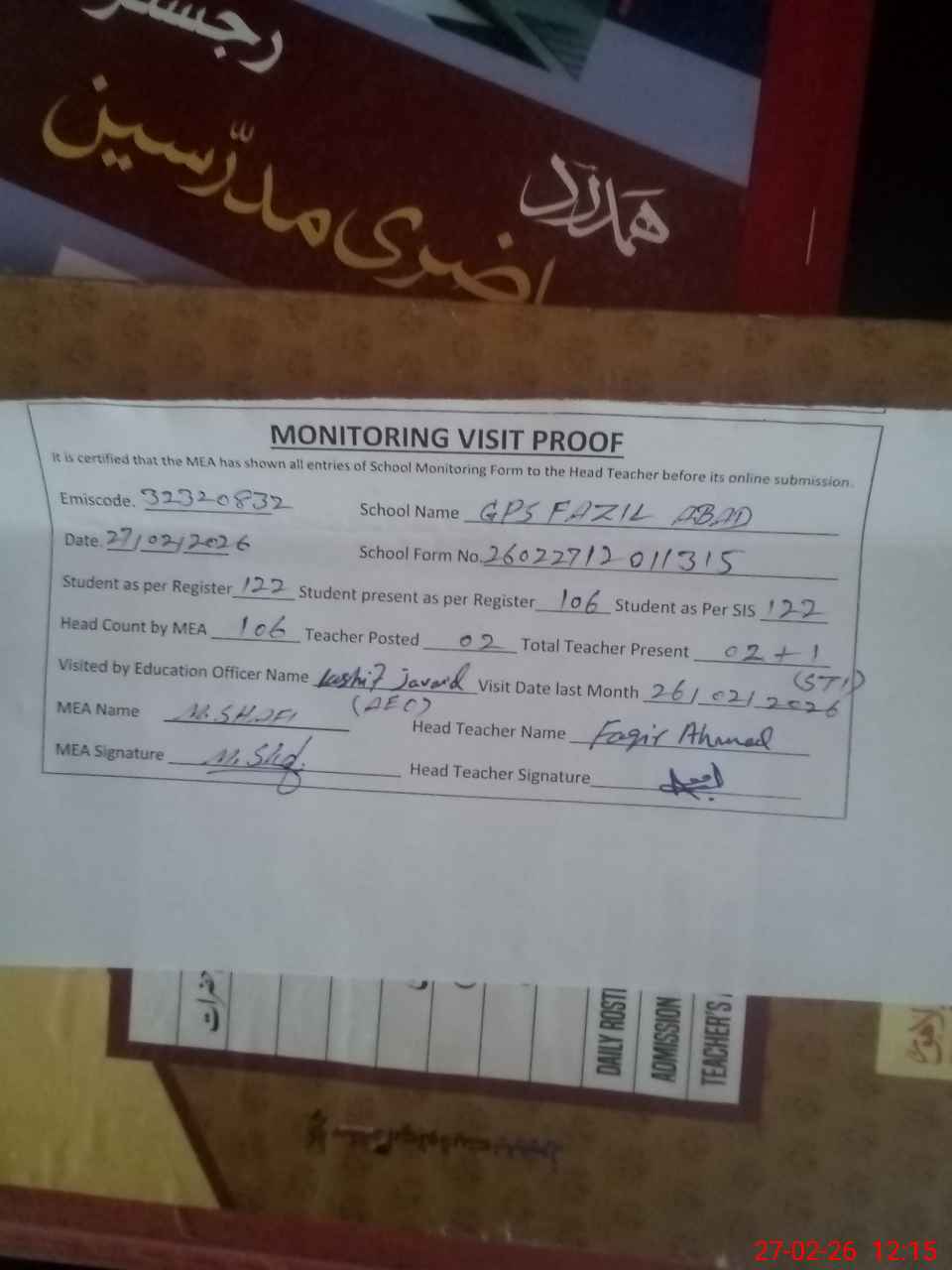 | EMIS Code: 32320832 | Name of School: GPS FAZIL ABAD | |||