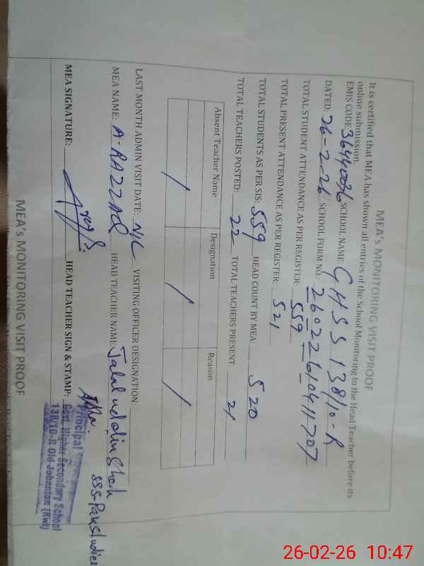 | EMIS Code: 36440036 | Name of School: GHSS 138/10-R, JAHANIAN | |||