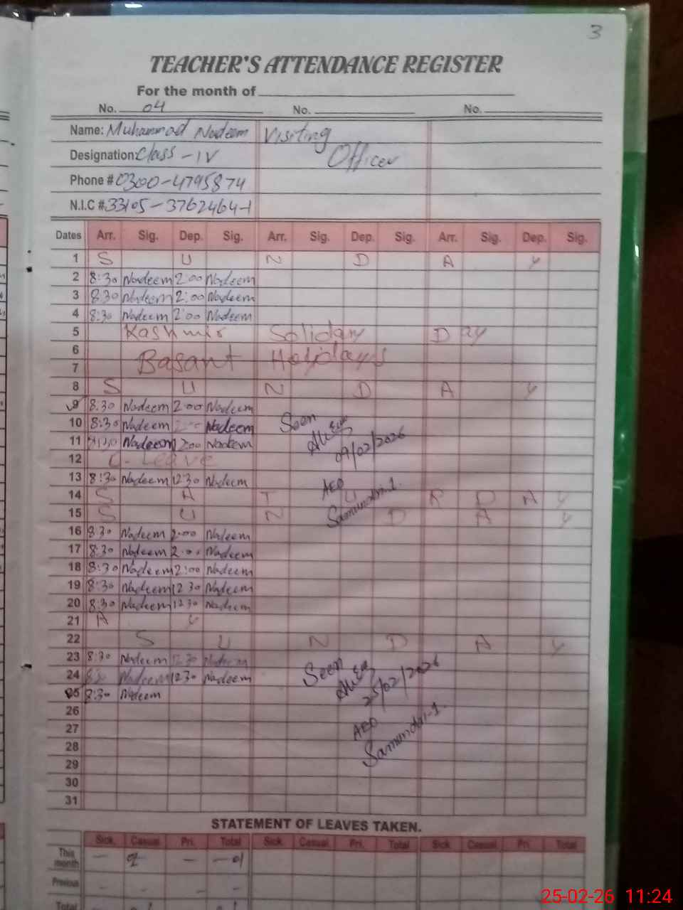 | CNIC | Full Name | Designation | R/C | Absence During Last Calender Month |