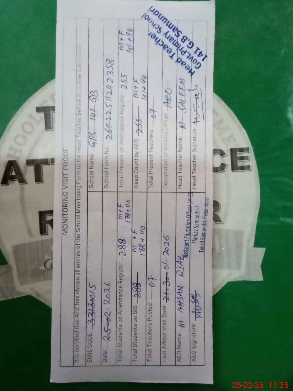 | Attendance Register | Head Teacher | MEA with School | Visit Proof |
