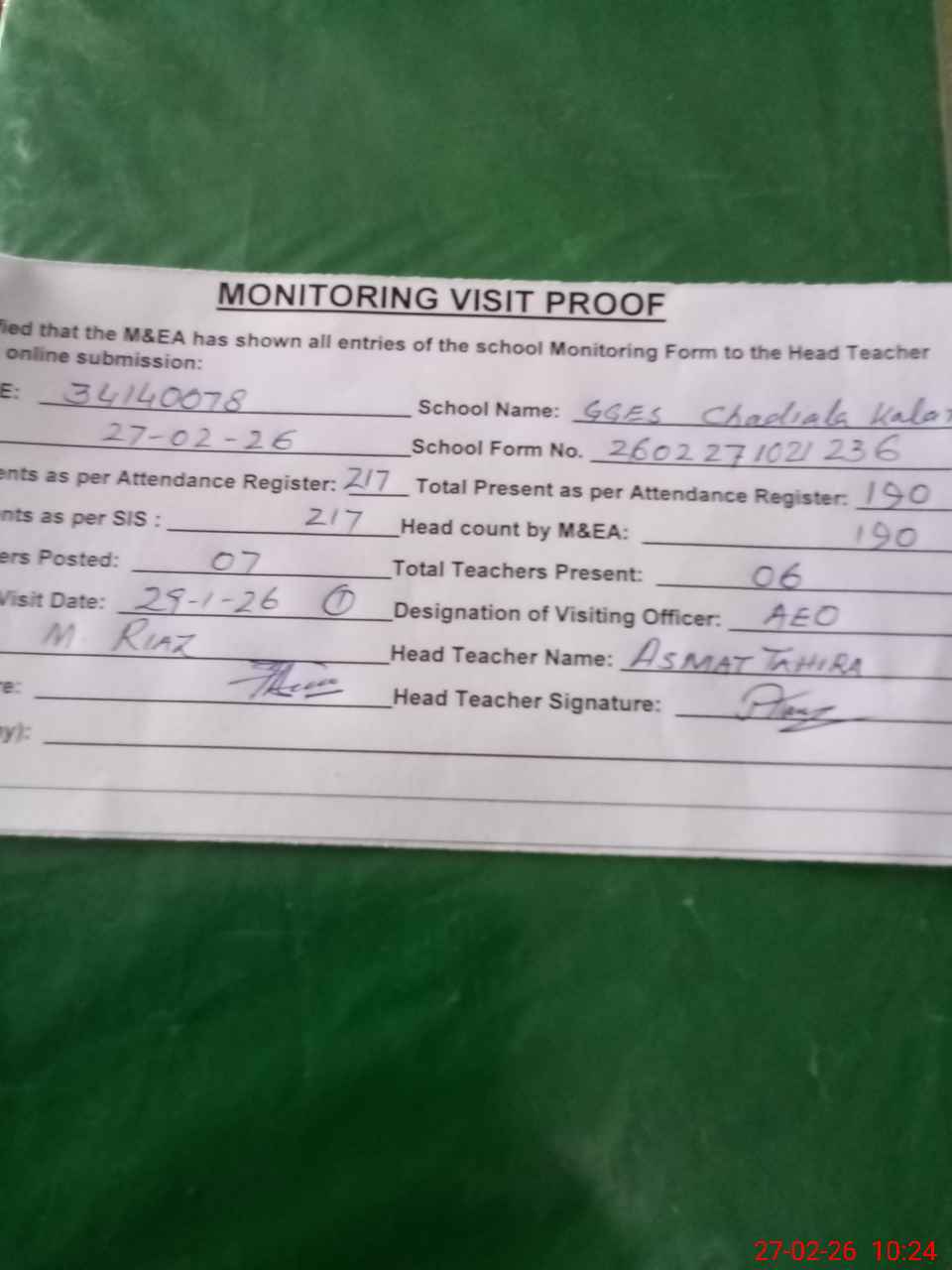 | Attendance Register | Head Teacher | MEA with School | Visit Proof |