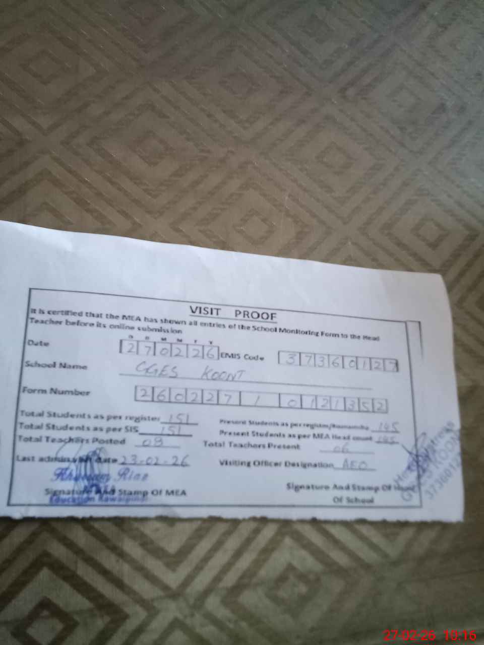 | Attendance Register | Head Teacher | MEA with School | Visit Proof |