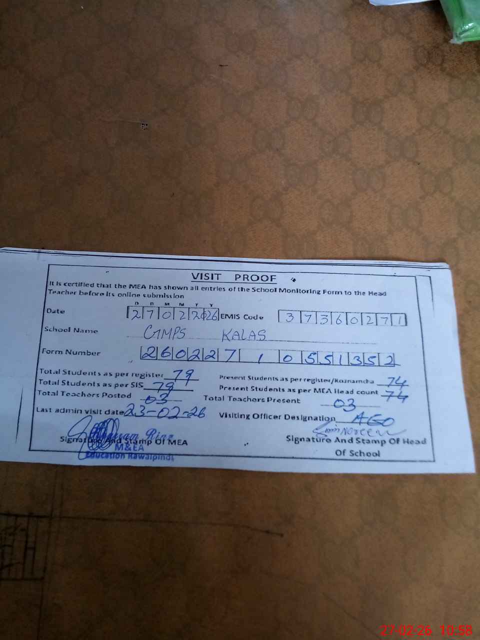 | Attendance Register | Head Teacher | MEA with School | Visit Proof |