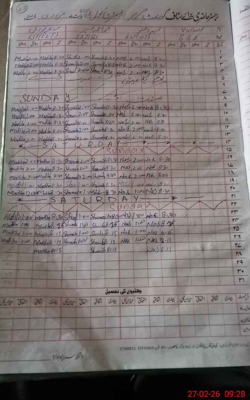 | 31**** | Na**** Qa**** | EST Urdu | Regular | 0 | 0 | 0 | 0 | 0 | 0 | 0 | 0 | 0 | Absent (Un-Authorized) |