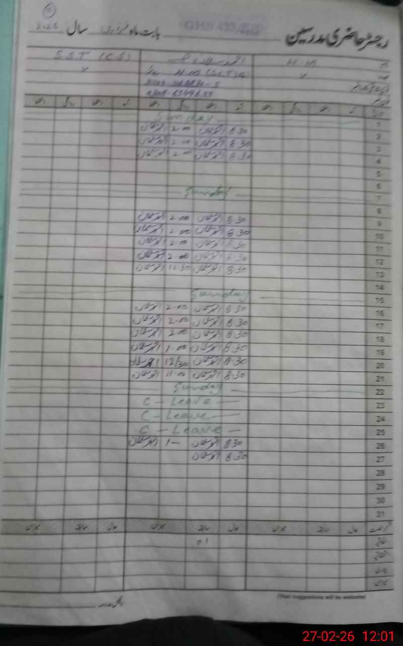 | CNIC | Full Name | Designation | R/C | Absence During Last Calender Month |