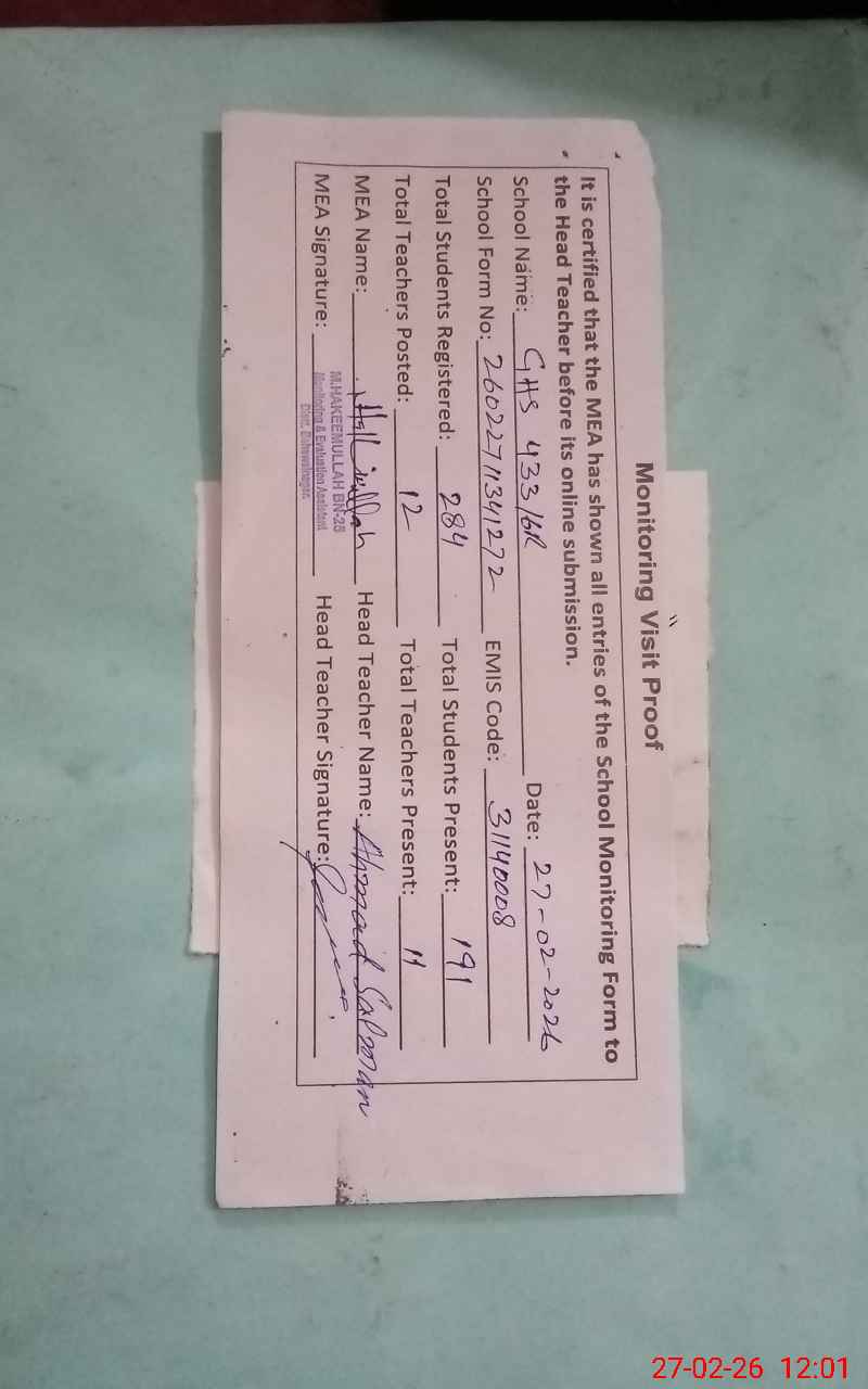 | EMIS Code: 31140008 | Name of School: GHS CHAK NO. 433/6-R | |||