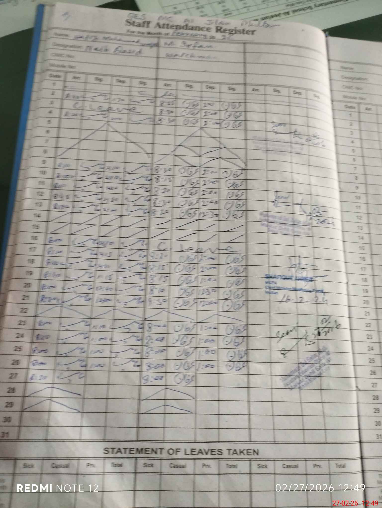 | CNIC | Full Name | Designation | R/C | Absence During Last Calender Month |