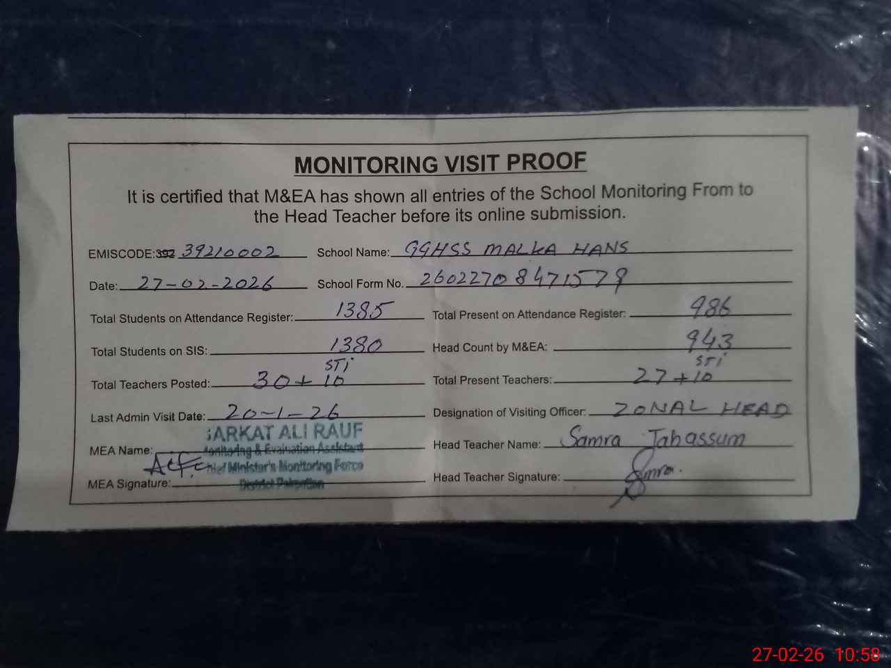 | Attendance Register | Head Teacher | MEA with School | Visit Proof |
