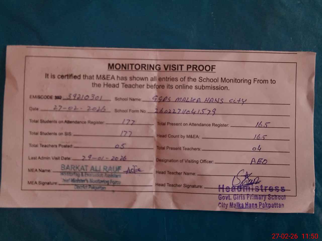 | Attendance Register | Head Teacher | MEA with School | Visit Proof |