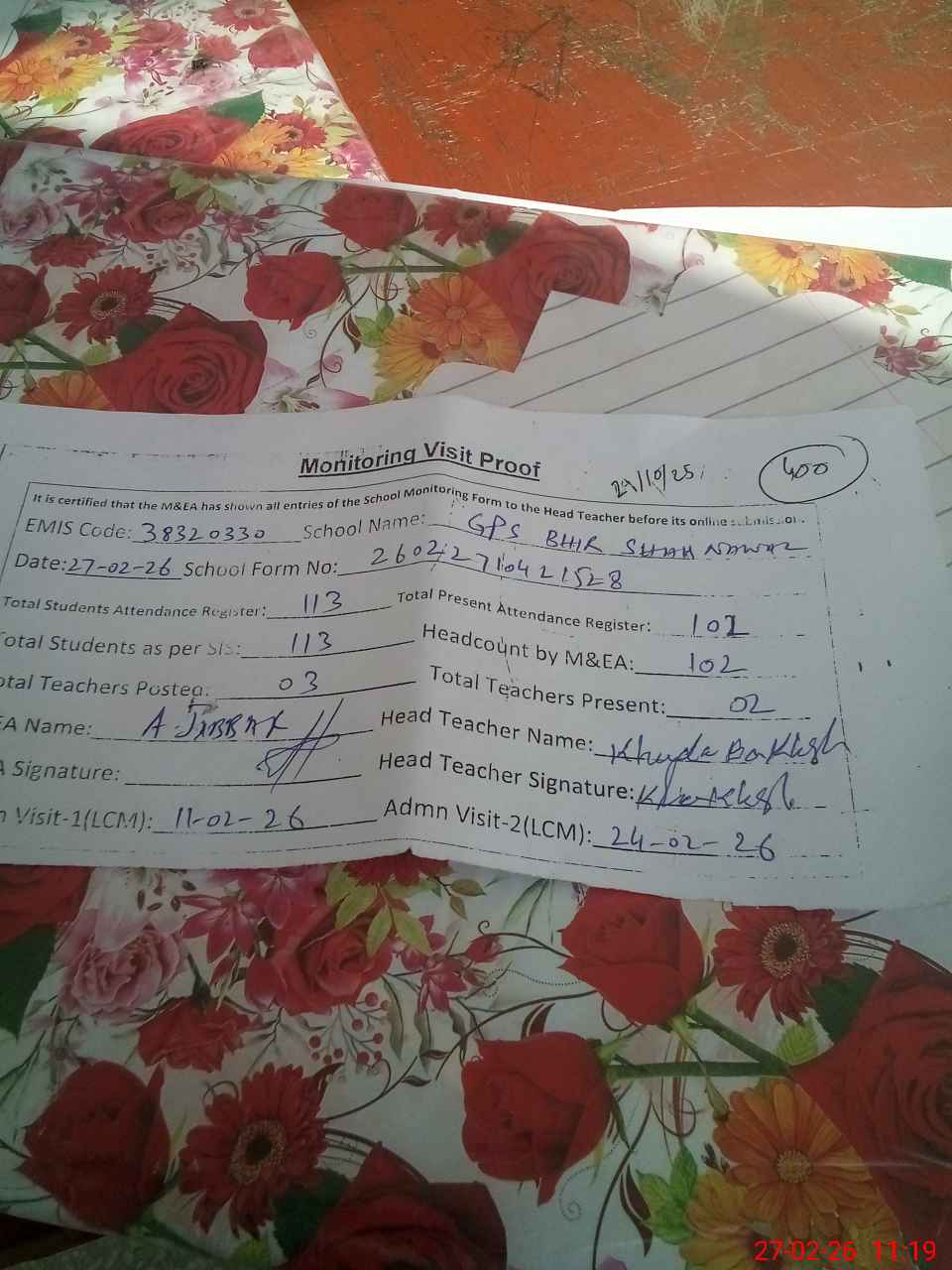 | Attendance Register | Head Teacher | MEA with School | Visit Proof |