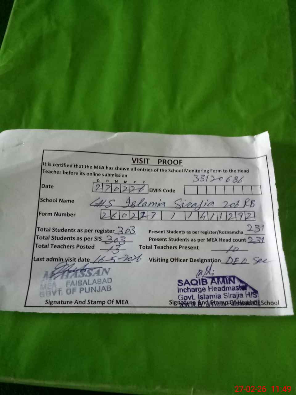 | Certified that this School was Inspected by the Undersigned MEA/DMO Today and the Information Stated Above is as Per Record. | |||||