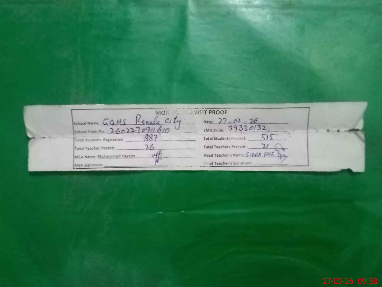 | Attendance Register | Head Teacher | MEA with School | Visit Proof |