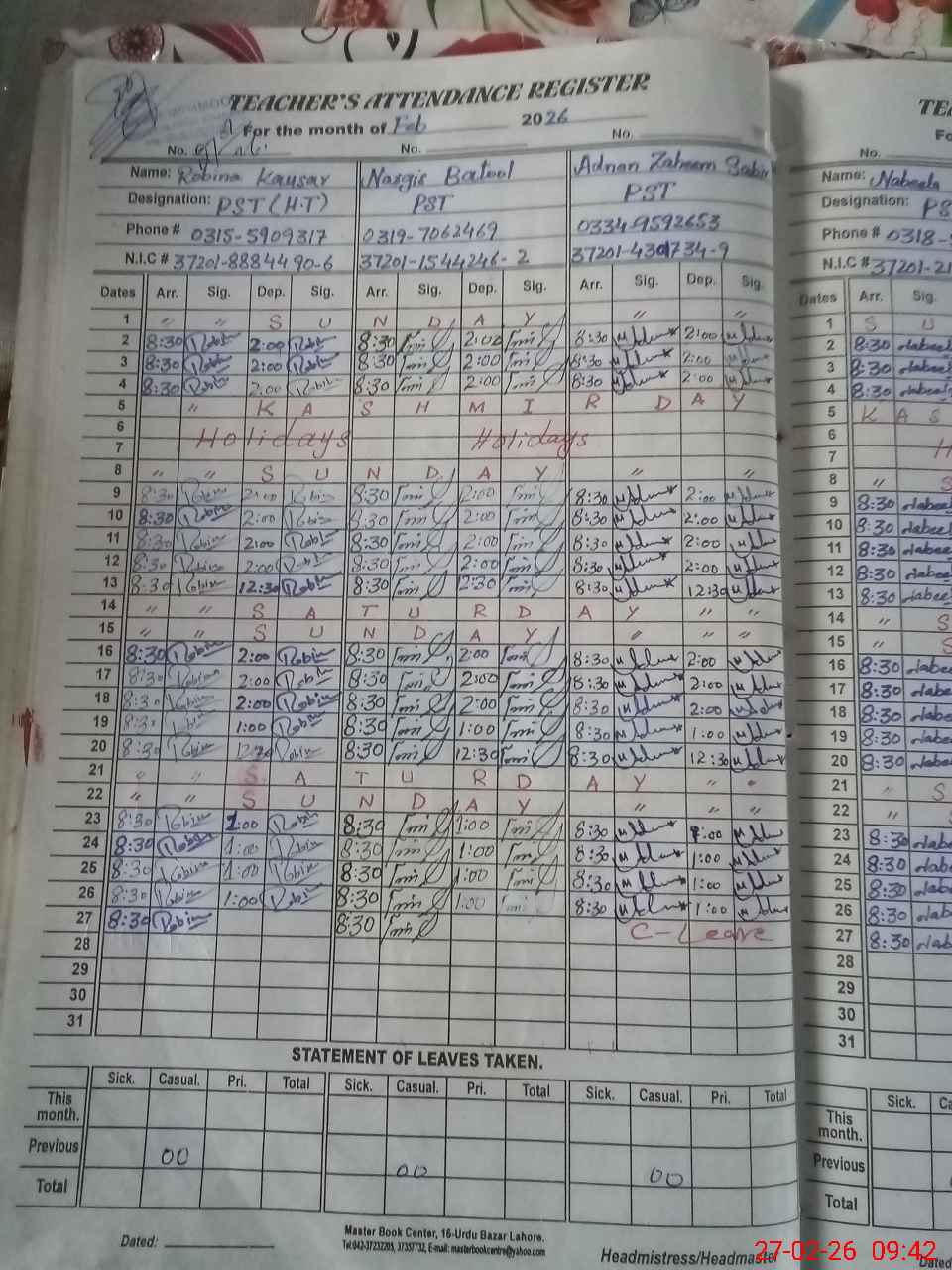 | CNIC | Full Name | Designation | R/C | Absence During Last Calender Month |
