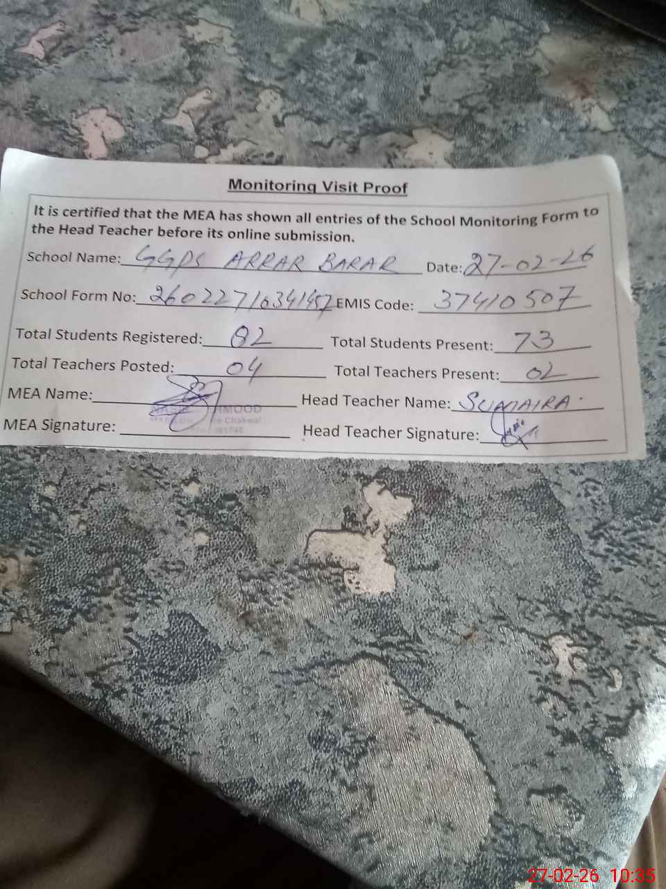 | EMIS Code: 37410507 | Name of School: GGPS ARAR BARAR PO DHUMAN CHAKWAL | |||