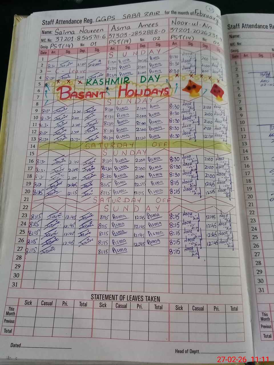| CNIC | Full Name | Designation | R/C | Absence During Last Calender Month |
