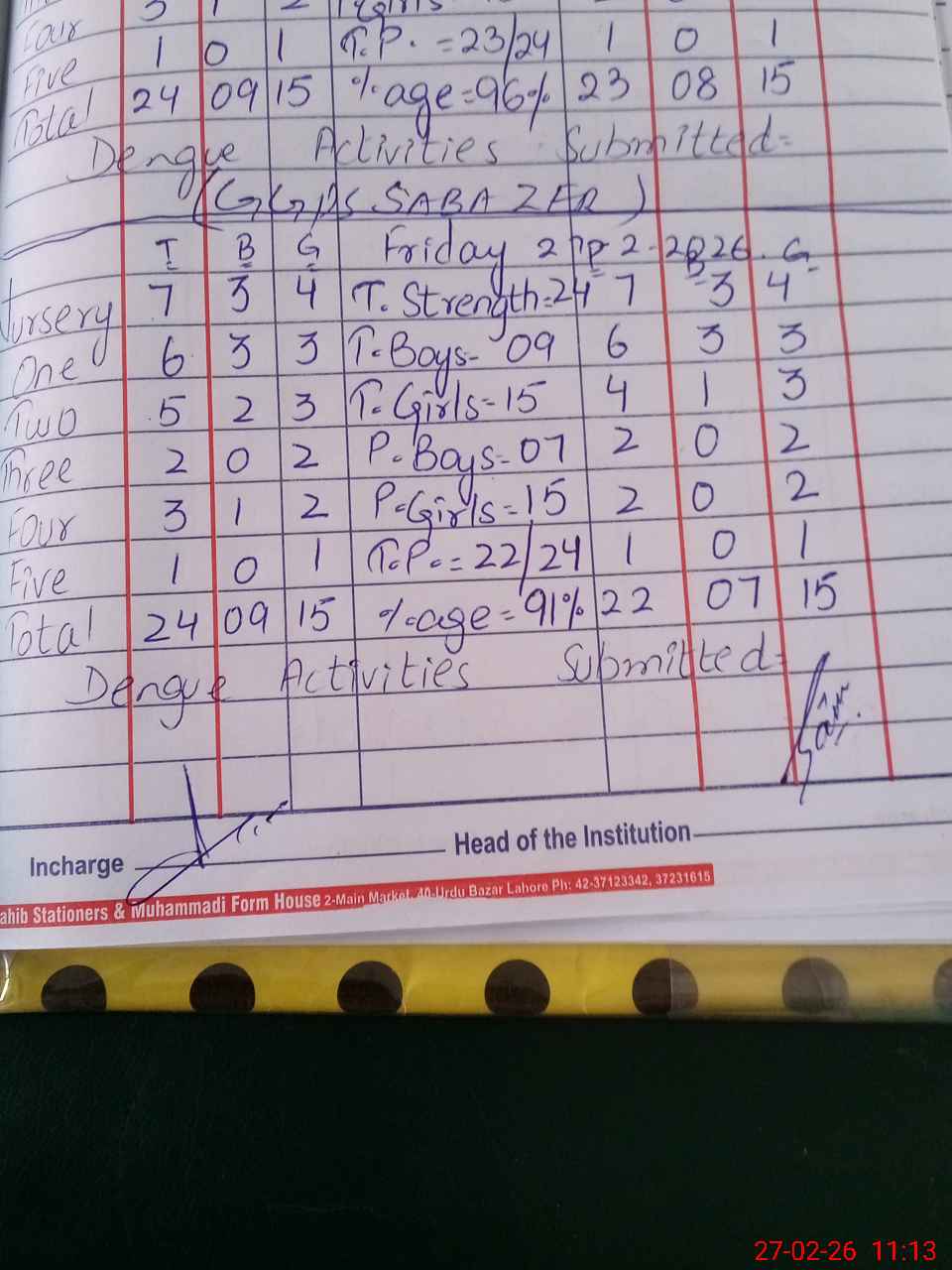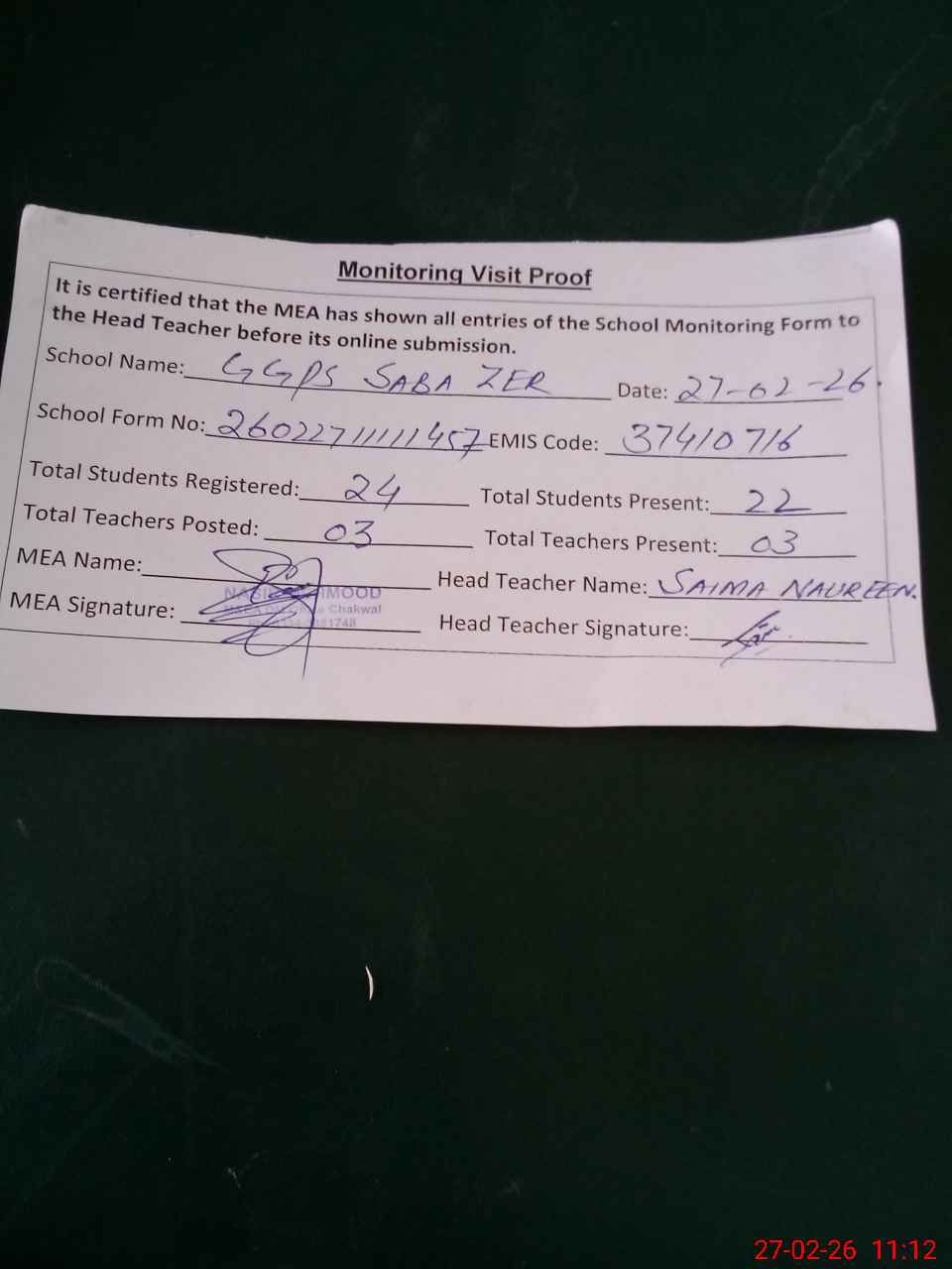| Attendance Register | Head Teacher | MEA with School | Visit Proof |
